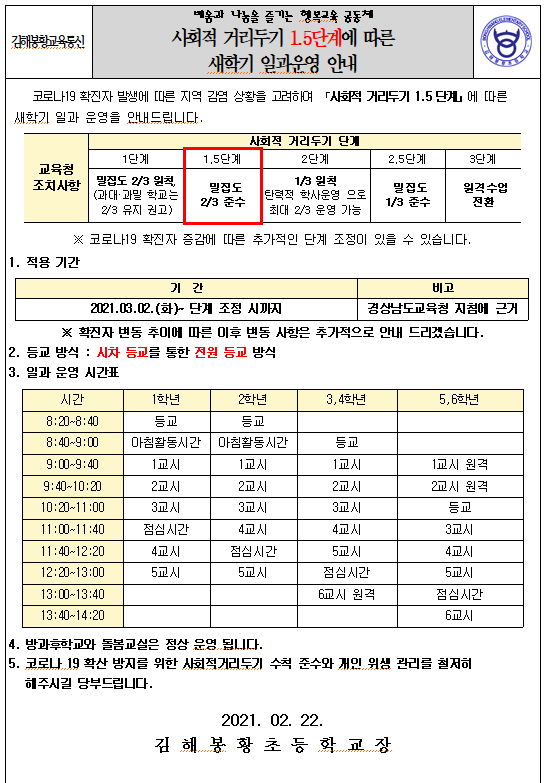 코로나 19 확진자 발생에 따른 지역감염상황을 고려하여 사회적거리두기 1.5단계에 따라 새학기 일과 운영을 아래와 같이 안내드립니다. 우리 아이들의 새학기 일과계획에 참고하여 주십시요.