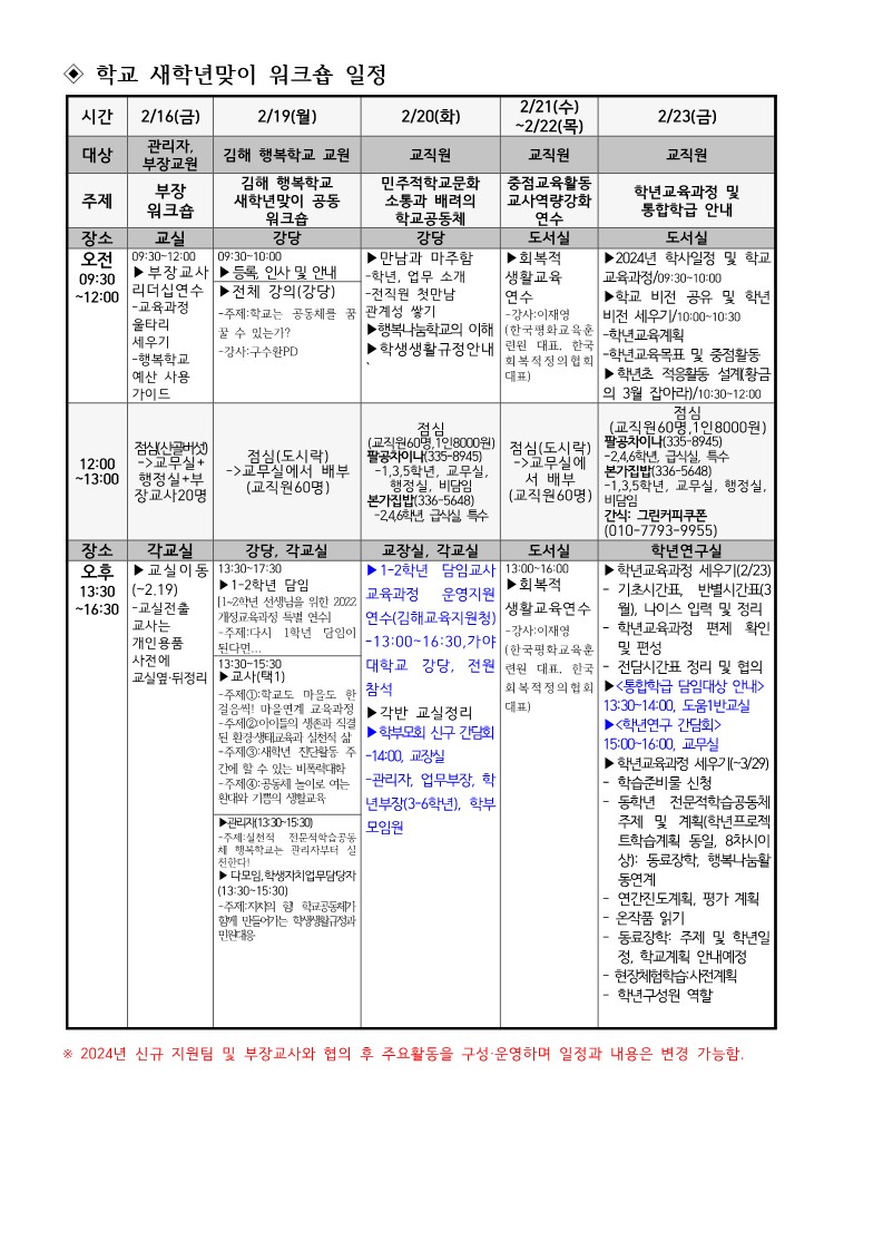 우리 학교에 부임하시는 선생님을 환영합니다. 2024학년도 새학년 맞이「교육과정 함께 세움 주간」을 아래와 같이 실시하니, 협조하여 주시기 바랍니다. 1. 관련: 정책기획관-19137(2023.12.28.) 「2024학년도 새학년 맞이 교육과정 함께 세움 주간 운영계획」 에 근거하여 별도의 출장 요청 공문 없이 출장 요청 사항을 신임교 홈페이지에 게시합니다. 2. 출장 요청 기간 가. 학년 및 학반 배정일: 2024.2.14.(수) 13:00, 도서관 나. 새학년맞이 워크숍 - 2023.2.19.(월)~2.23.(금) 09:30~16:30 - 부장교사: 부장워크숍 2023.2.16.(금) 09:30~16:30 3. 장소: 김해봉황초등학교 도서관 및 강당 4. 주요 내용: 학교 비전 및 학교교육계획 공유, 학교·학년교육과정 편성·운영 연수 등 2024. 2. 06. 김해봉황초등학교장